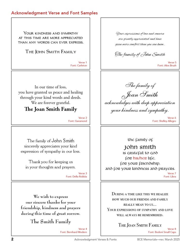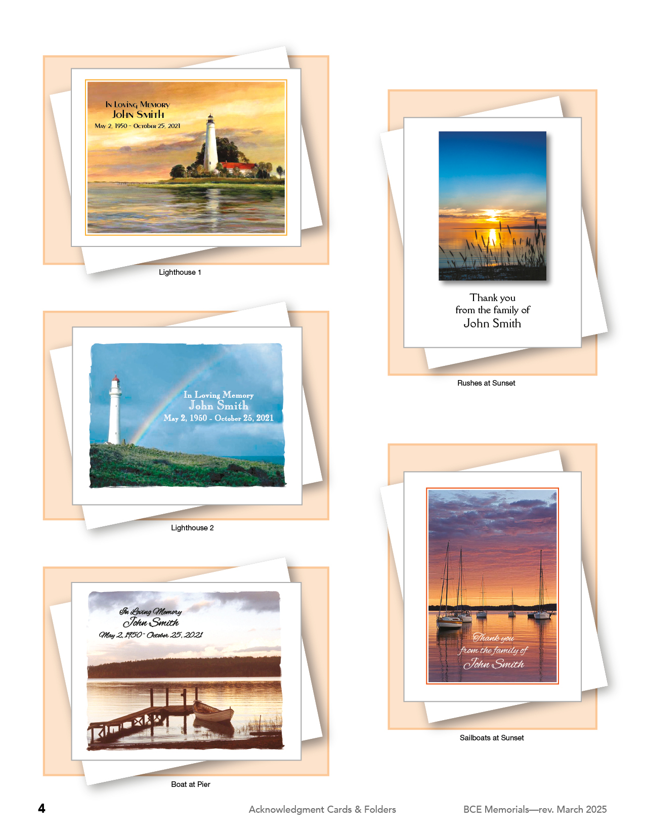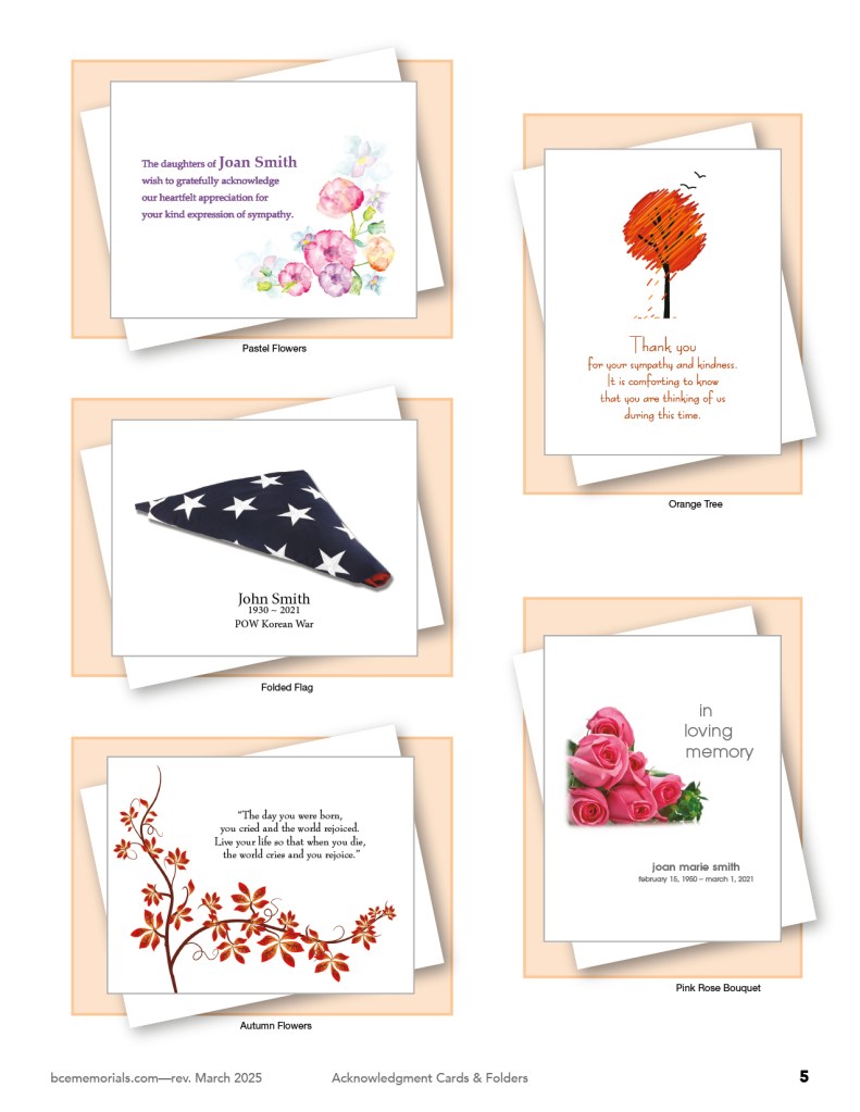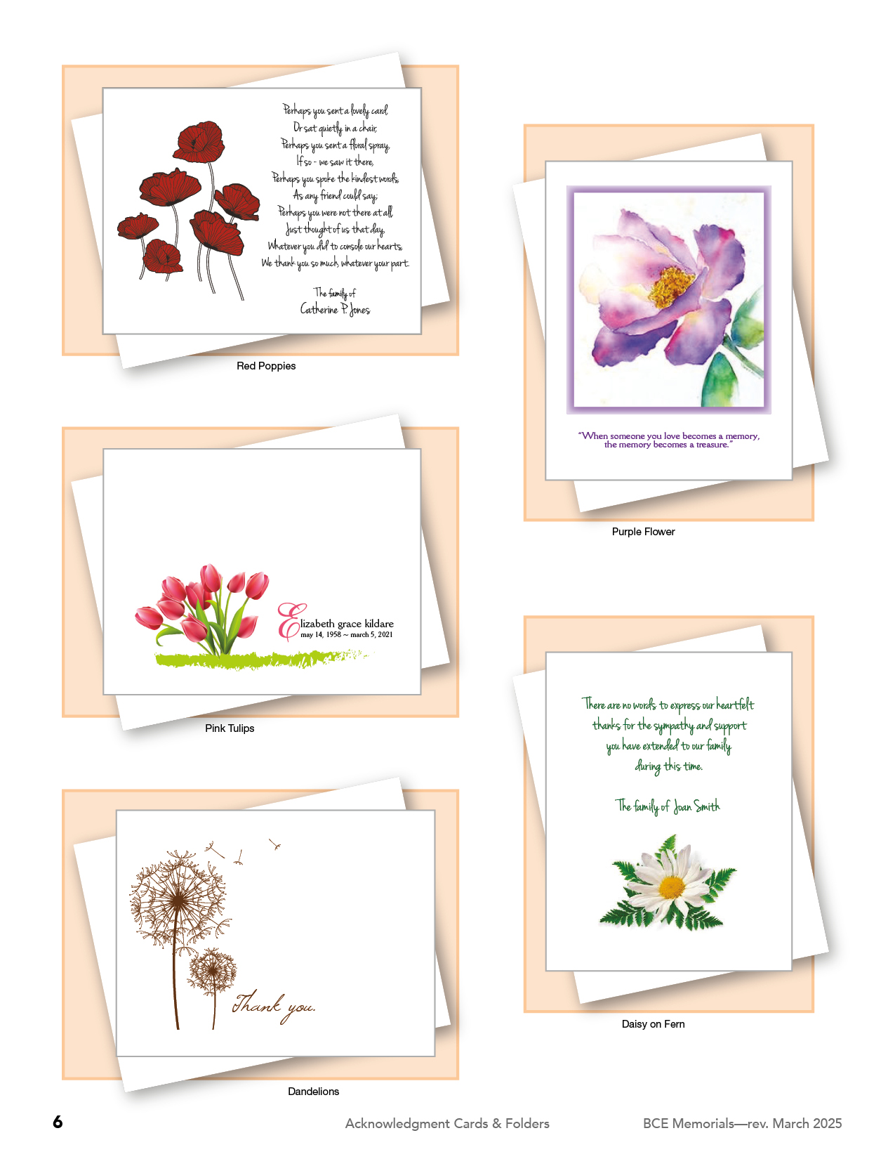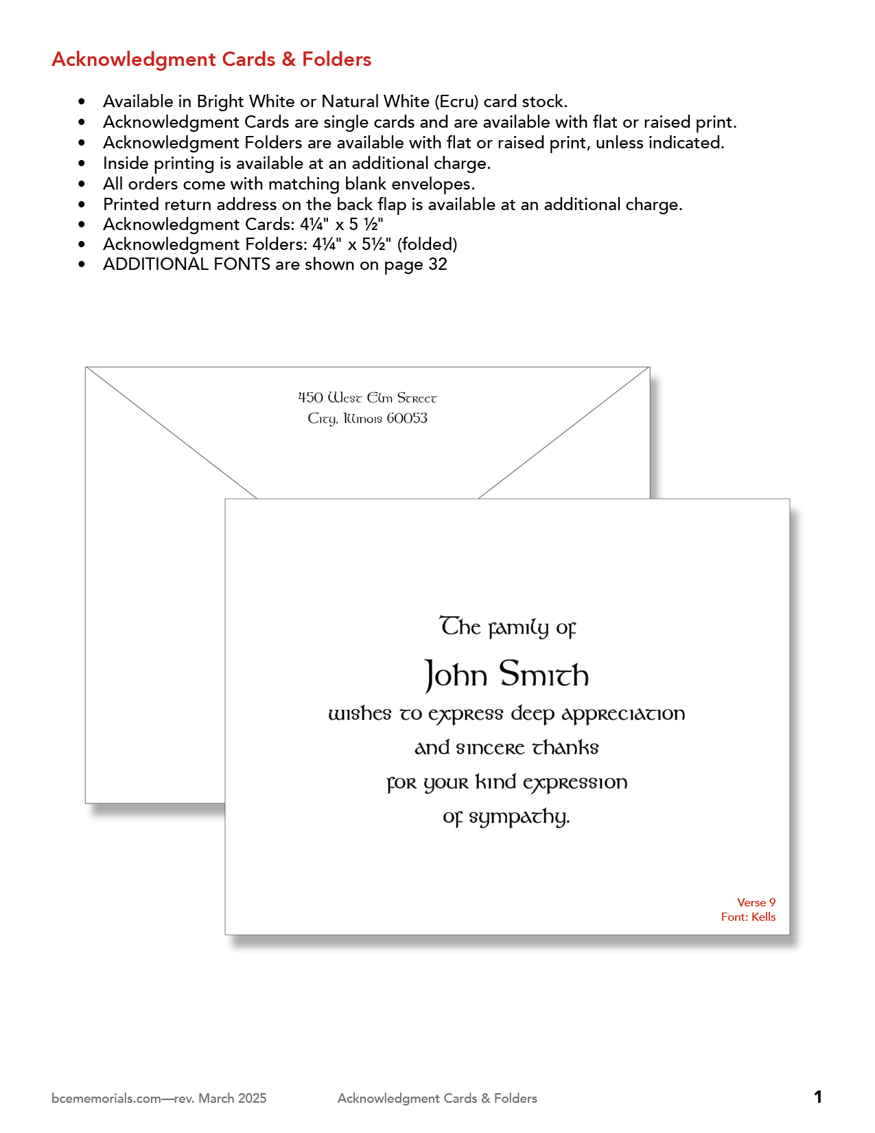 Our Acknowledgment or Thank You Cards are available in Bright White or Natural White. Orders can be finished as single cards or as folders. Cards cannot be back printed, but folders can have inside printing. Acknowledgment cards and folders can be flat or raised printed. All orders come with matching blank envelopes. We can also print a return address on the back flap.